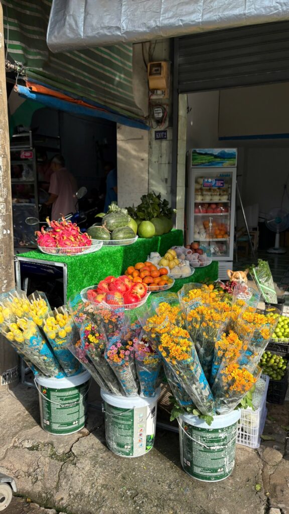 -Hiện tại em đang kinh doanh giỏ quà trái cây và hoa tươi, nước ép (bán đều khách mỗi ngày)